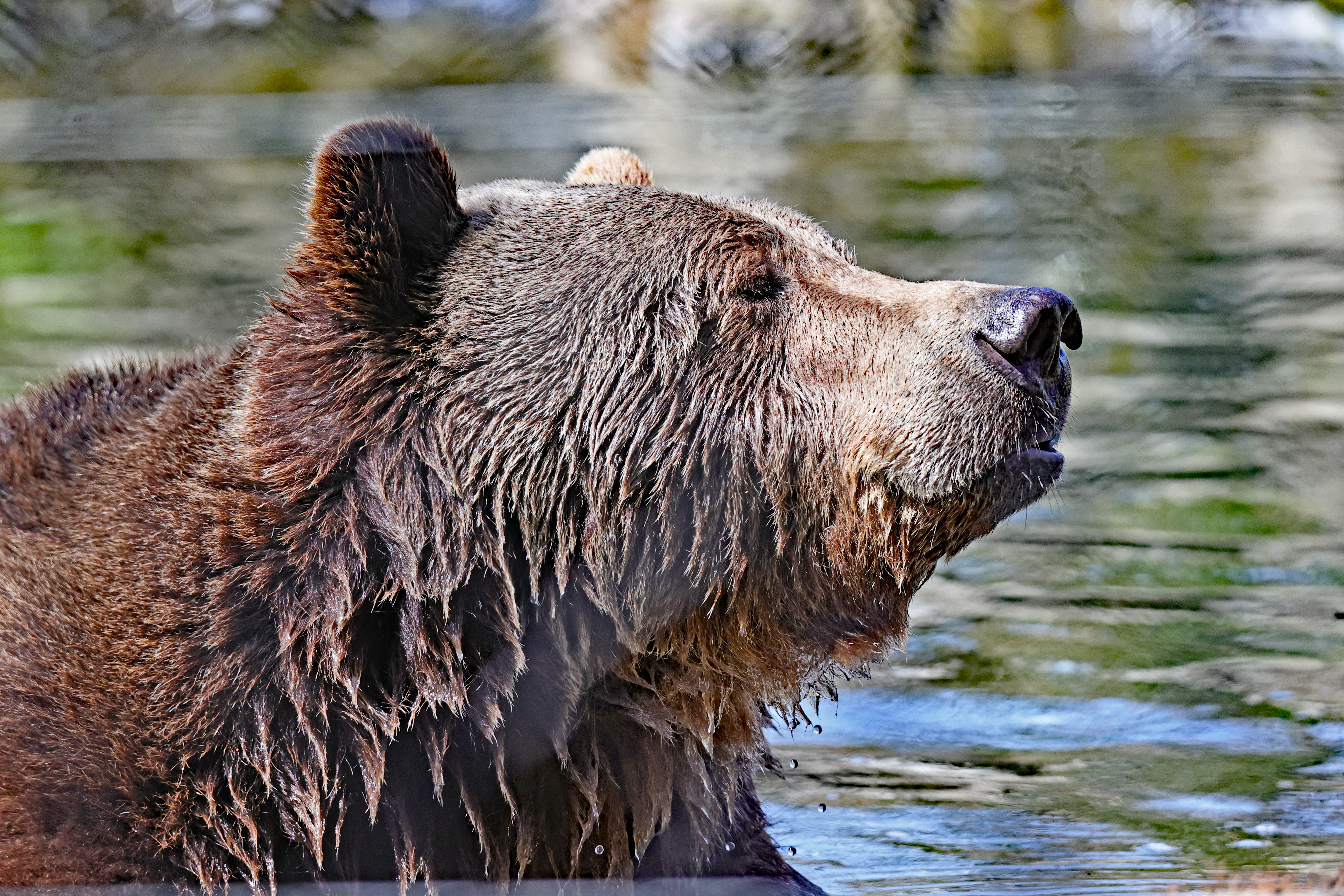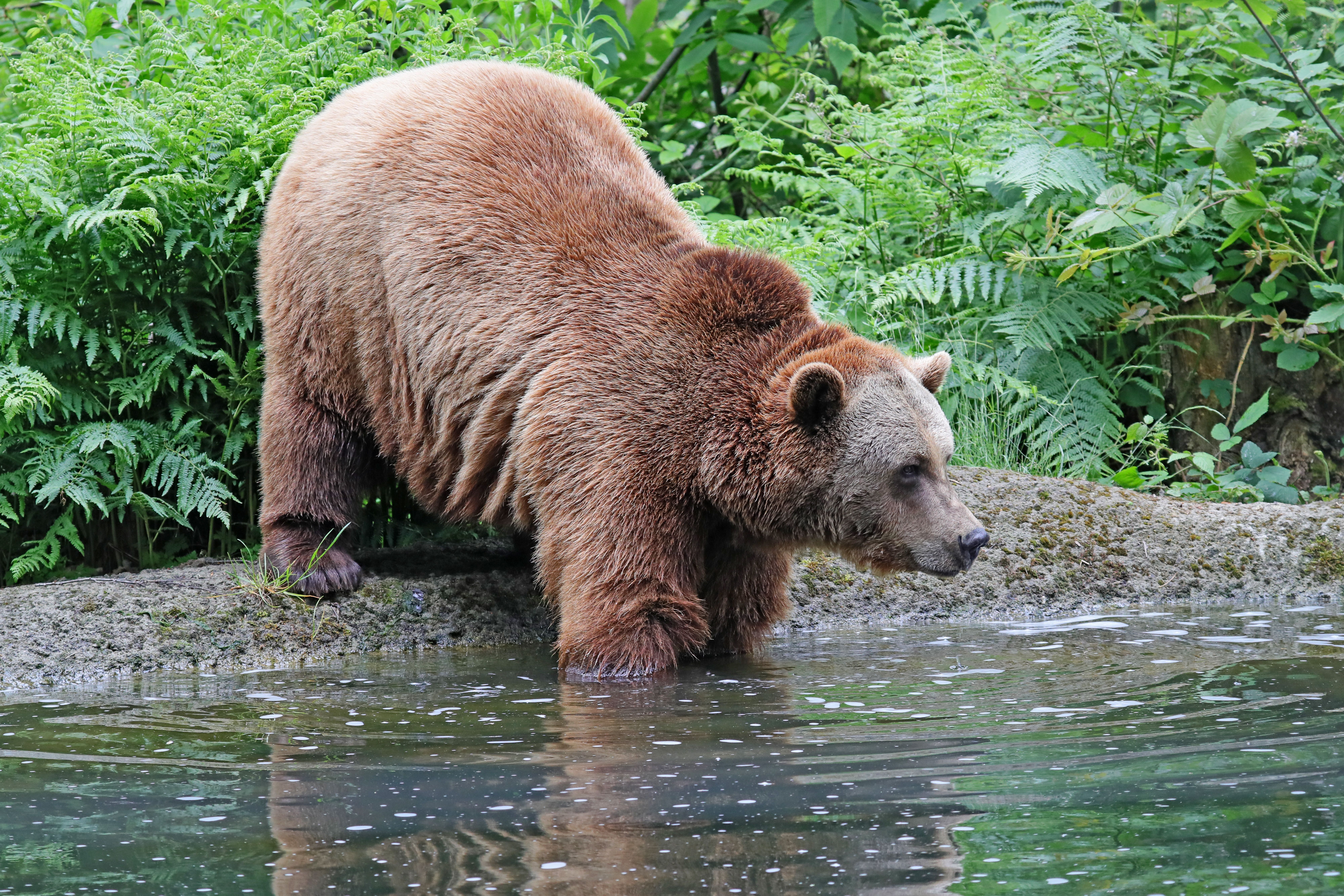 They now have a large woodland enclosure full of trees and plant life for them to forage through, caves to explore, and a pond with a waterfall to play in.